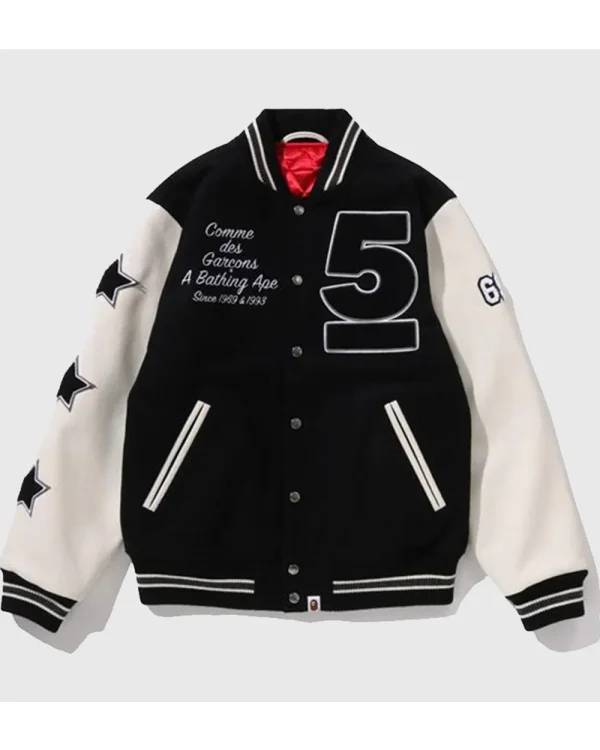 The A Bathing Ape X Comme Des Garçons Osaka Varsity Jacket blends streetwear cool with designer flair. It features bold embroidered logos from both brands, symbolizing their unique collaboration. The snap-button closure and classic varsity look make it stand out effortlessly. It’s a true fashion piece with urban energy.