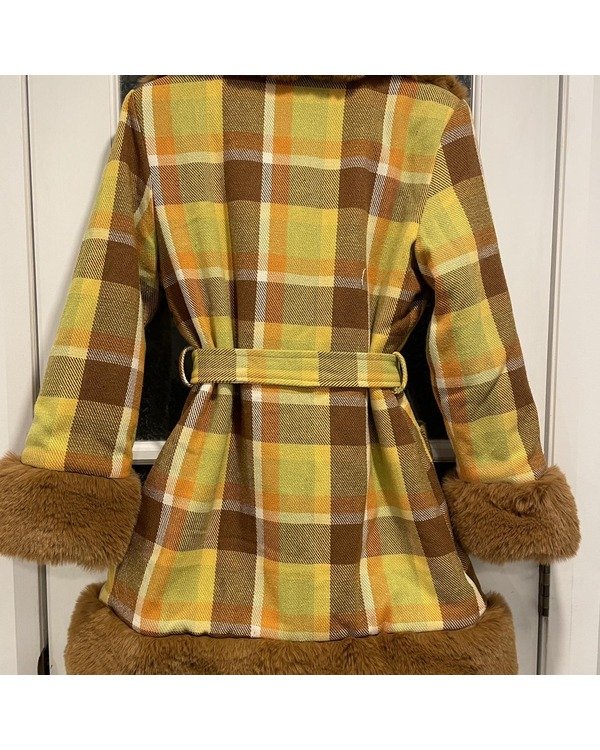 This coat is made from soft plaid fabric that feels cozy and smooth. It has a warm inner lining to keep you comfortable in cold weather. The fur collar and cuffs add extra warmth and style. The stitching is strong and neat for long-lasting wear. We also have Aeropostale Kansas City Chiefs Track Jacket.