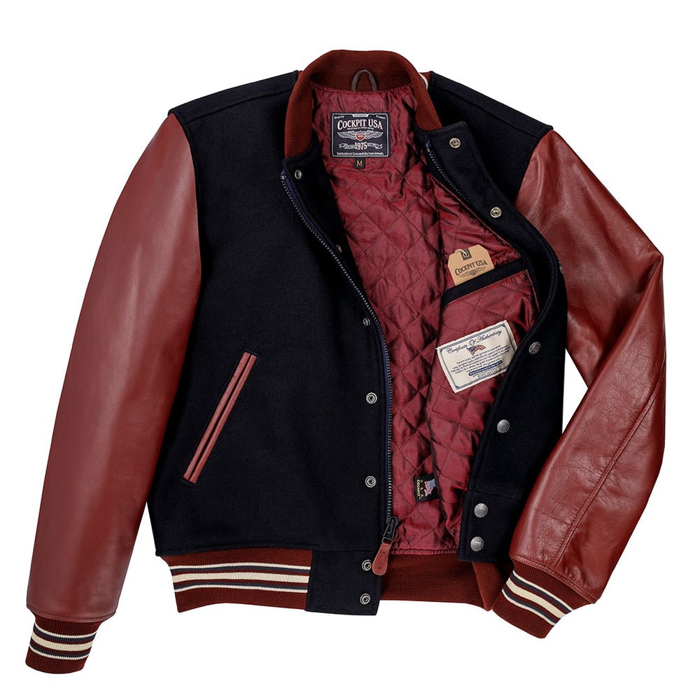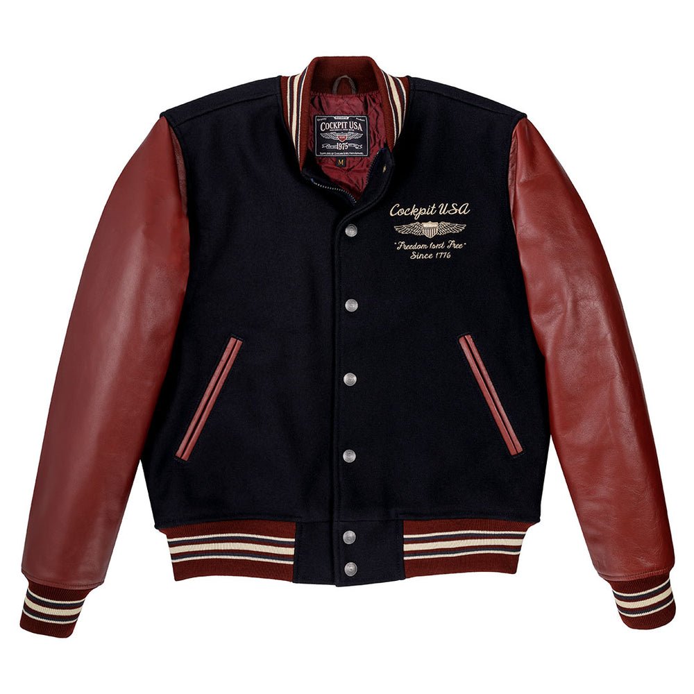 The central feature of this statement jacket is the expertly embroidered appliqué on the back. It showcases a US Air Force F-16 Falcon Fighter Jet flying across the American Flag, making it a powerful patriotic leather jacket. We also have Cockpit USA Letterman Jacket Z21P016.