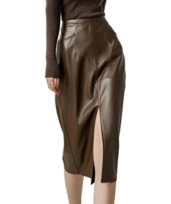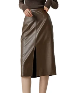 This midi skirt is crafted from genuine or high-quality faux leather, typically with a sleek, smooth, or subtly textured finish. It comes in various classic colors like black, brown, or camel. The design features a midi length, generally falling below the knee but above the ankle, and a distinctive front slit for movement and style. We also have Freya Pink Leather Moto Leather Jacket.