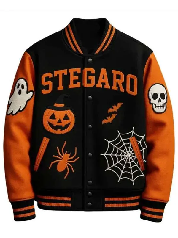 This jacket has a spooky varsity look inspired by Halloween pumpkin themes. The clean design gives a fun festive and modern touch. It pairs easily with jeans tees and Halloween outfits. It adds comfort and a bold seasonal style to your daily look.
