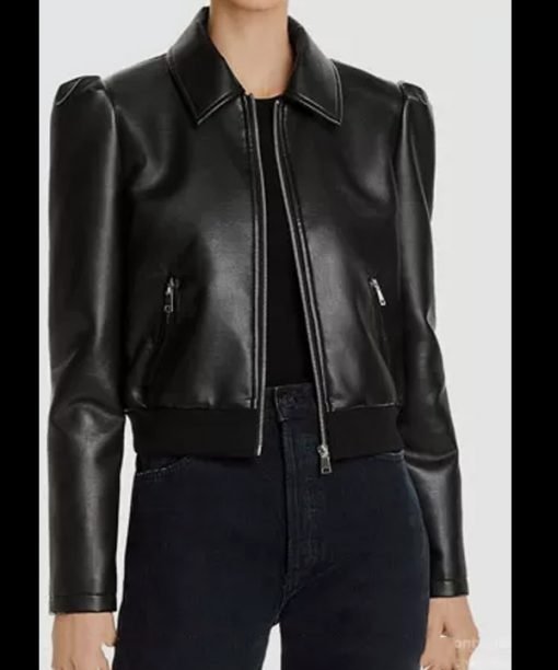 This bomber jacket features a classic bomber silhouette with a sleek black leather finish. The structured yet relaxed fit enhances its stylish look while allowing easy movement. Its clean design pairs effortlessly with jeans, skirts, or casual outfits, making it ideal for daily wear and modern street fashion looks.