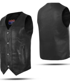 A classic black leather motorcycle vest with a clean V-neck design for a bold biker look.