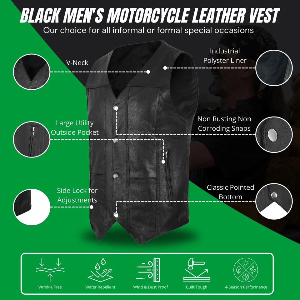 - Style: Classic V-neck motorcycle vest design