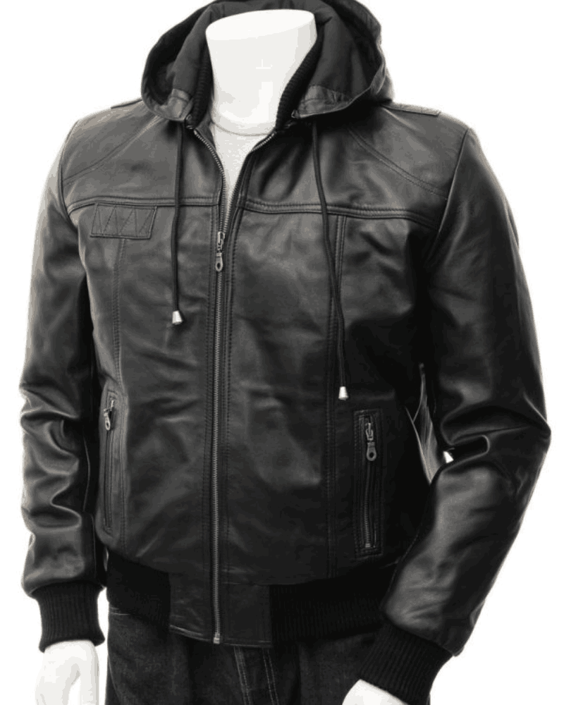 Men’s Black Leather Hoodie Jacket