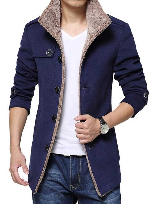 A blue wool jacket with shearling lining pairs perfectly with casual essentials for rugged, everyday wear. Match a darker navy wool coat with well-fitted denim jeans and sturdy leather boots for a classic look. Alternatively, layer your jacket over a cream or grey turtleneck sweater and pair it with beige chinos for a sophisticated weekend ensemble.