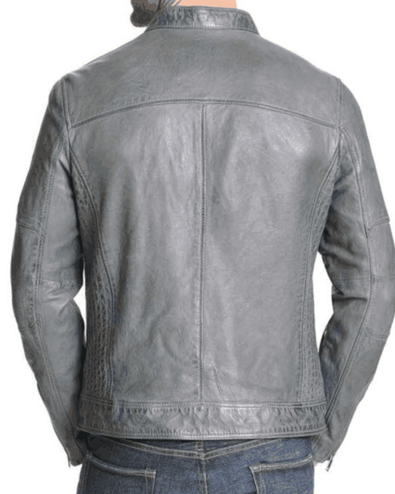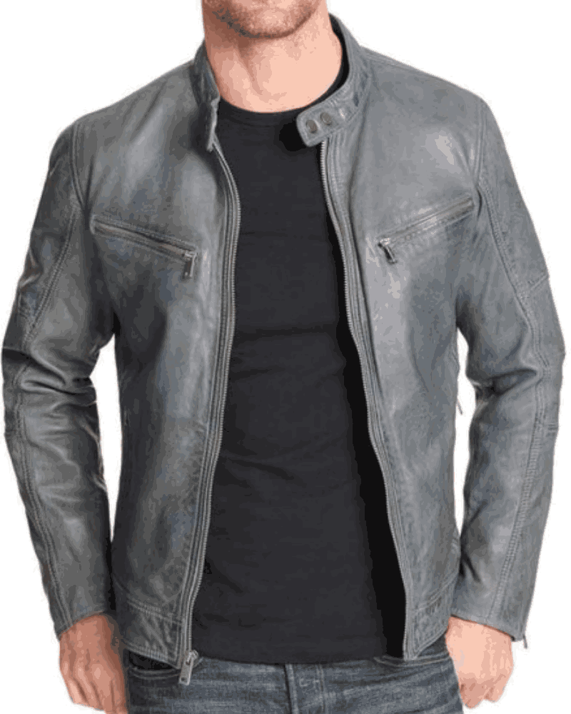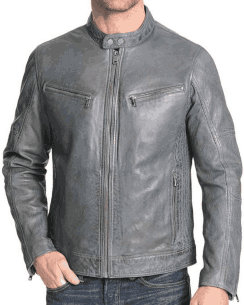 Men’s Mock Collar Zipper Pockets Grey Leather Motorcycle Jacket