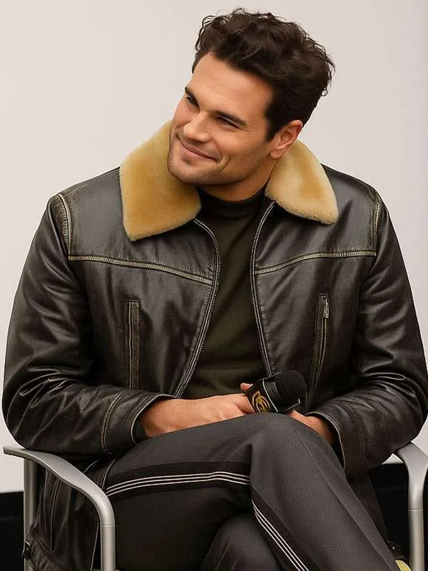 This jacket has a clean classic design inspired by Tom Bateman’s look at the BAFTA event. The leather and shearling mix gives a bold simple and modern touch. It matches jeans shirts and casual outfits with ease. It adds warm comfort and timeless charm to your daily fashion.