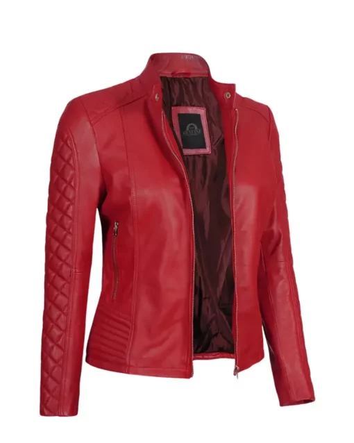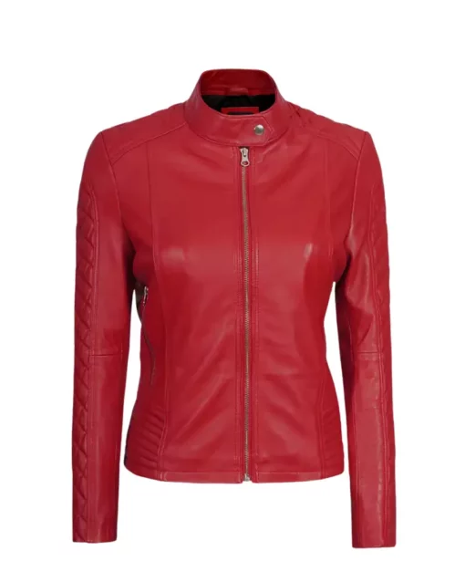 It features a structured, timeless silhouette that is designed for a comfortable, snug fit. The jacket has a short, banded collar with a snap-button closure and a straight front zipper. Key details include a prominent crimson biker attire color and unique diamond or horizontal padded red leather outerwear stitching on the shoulders and sleeves. The sleeves are full-length, providing a streamlined and flattering look.