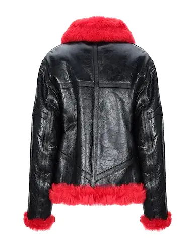 It features a structured, versatile silhouette that is designed for a comfortable, modern fit. The jacket has a broad faux fur collar and a front zipper closure. Key details include a prominent crimson plush outerwear color and visible faux fur detailing that highlights its quality. The sleeves are full-length, often with faux fur cuffs, providing a streamlined and flattering look.