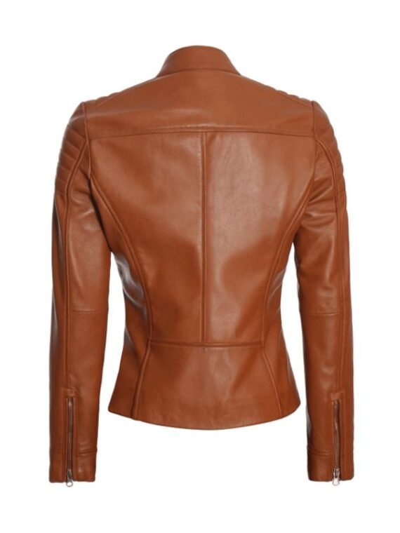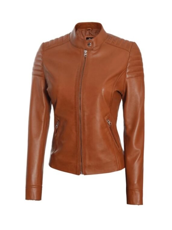 This jacket is crafted from genuine or high-quality faux leather in a sophisticated tan color. The material has a sleek or subtly textured finish. The design is a timeless piece, offering a lighter, more versatile alternative to classic black and brown jackets. It can be found in various styles, from a simple, tailored fit to a more elaborate design. We also have Womens Biker Asymmetrical Maroon Leather Jacket.