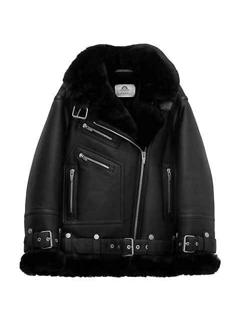 It features a structured, versatile silhouette that is designed for a comfortable, modern fit. The jacket has a broad shearling collar and a front zipper closure, often with buckle details. Key details include a prominent black color and visible stitching that highlights its quality. The sleeves are full-length, providing a streamlined and flattering look.