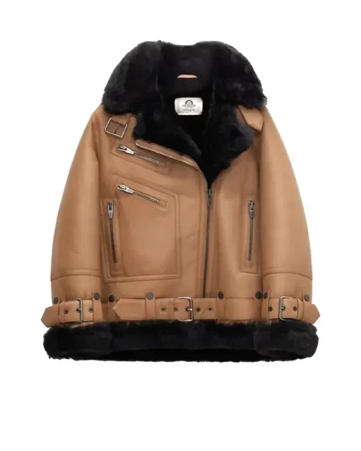 It features a structured, versatile silhouette that is designed for a comfortable, modern fit. The jacket has a broad shearling collar and a front zipper closure, often with buckle details. Key details include a prominent brown or black color and visible stitching that highlights its quality. The sleeves are full-length, providing a streamlined and flattering look.
