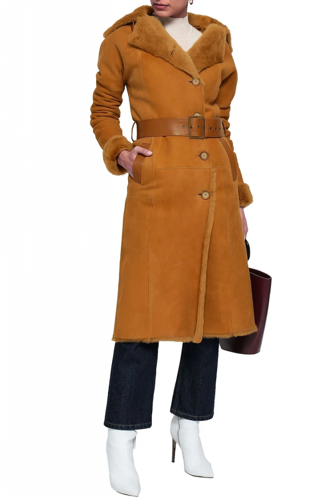 Womens Camel-Brown Belted Shearling Coat