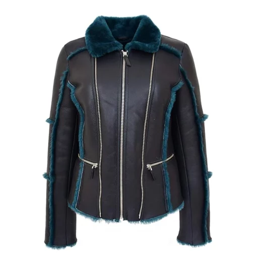It features a structured, versatile silhouette that is designed for a comfortable, modern fit. The jacket has a broad shearling collar and a front zipper closure. Key details include a prominent brown or black color and subtle stitching that highlights its quality. The sleeves are full-length, often with shearling cuffs, providing a streamlined and flattering look.